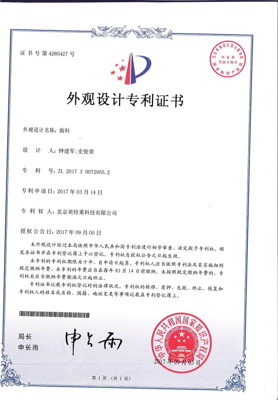 英特萊?商標(biāo)獲國(guó)家注冊(cè)